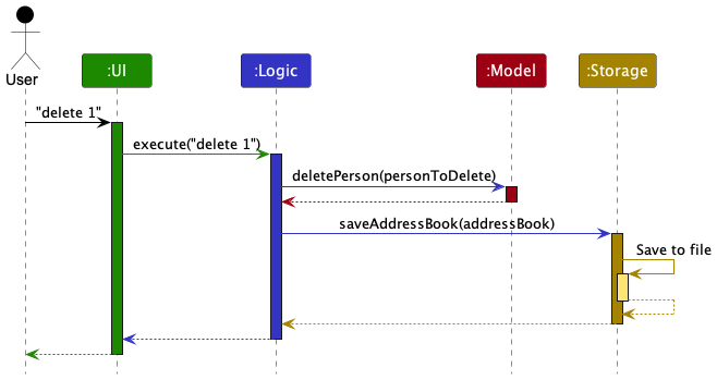 The Sequence Diagram below shows how the components interact with each other for the scenario where the user issues the command delete 1.